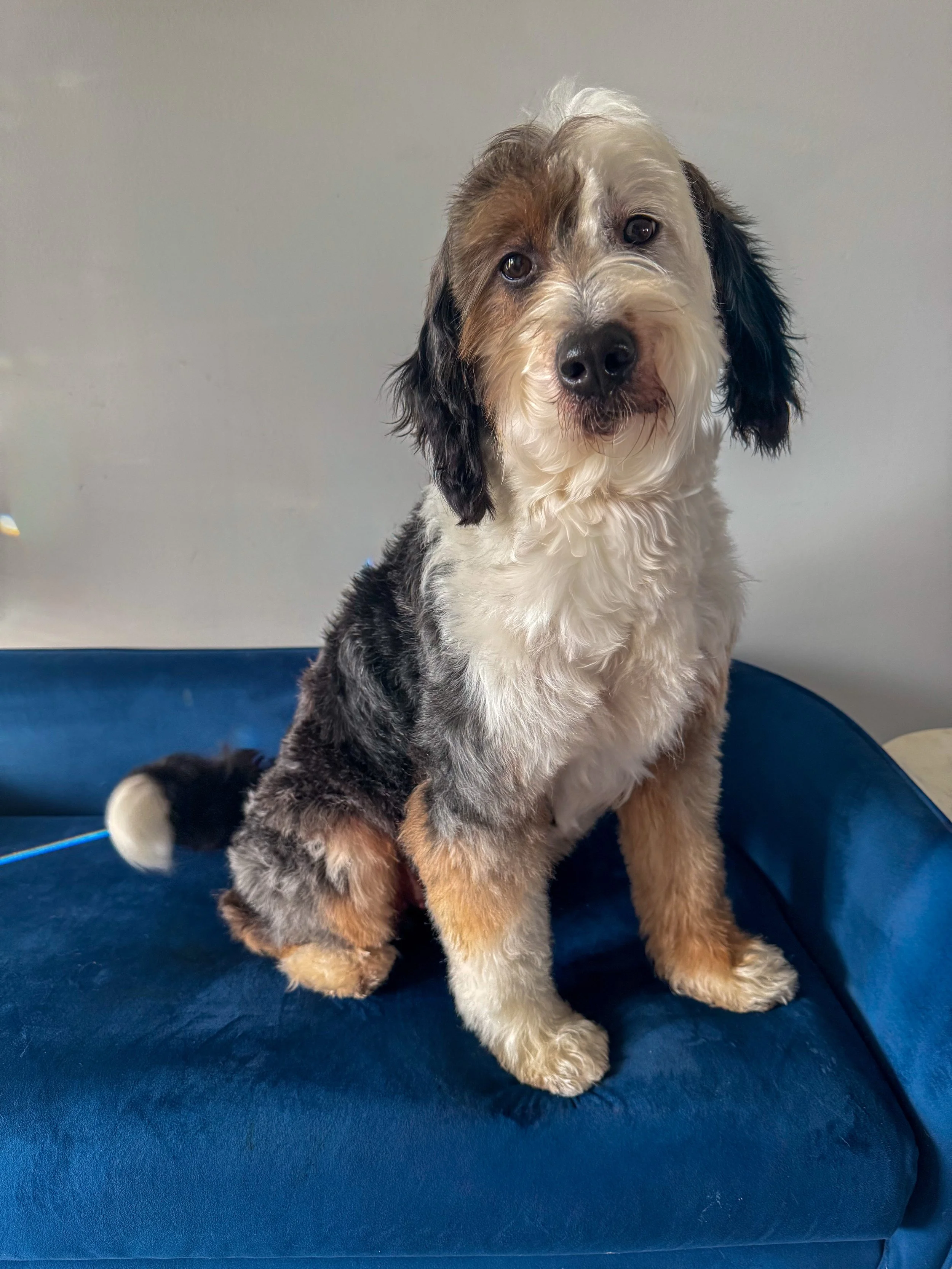 Classic tri-colored coats (black, rust, and white) with stunning markings. Friendly, loyal, and balanced in energy — a beautiful mix of Bernese heart and Poodle smarts.