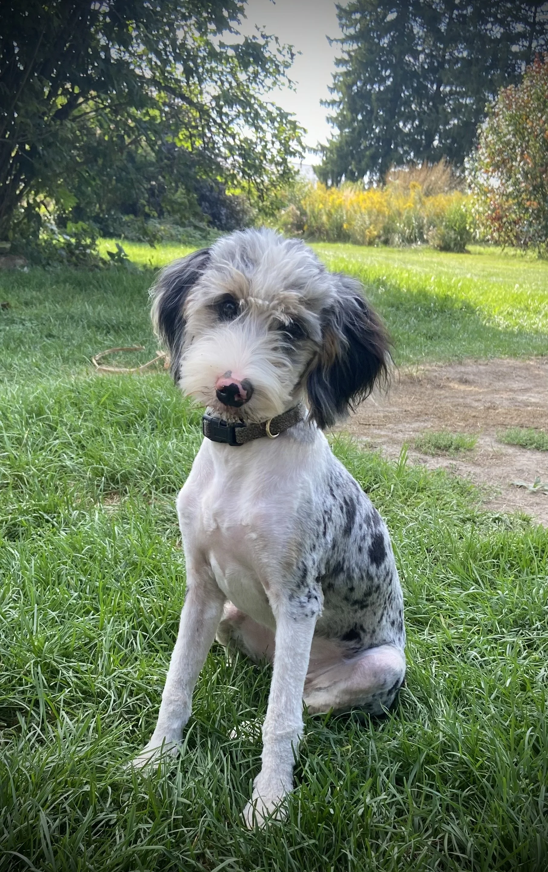 This pairing is anticipated to produce beautifully marked tri-coloured and Merle coats with sizes averaging 20–30 lbs full grown. These puppies will carry the same friendly, intuitive nature of our Bernedoodles in a smaller, more portable size — perfect for families or individuals looking for a confident, social, low-shedding companion