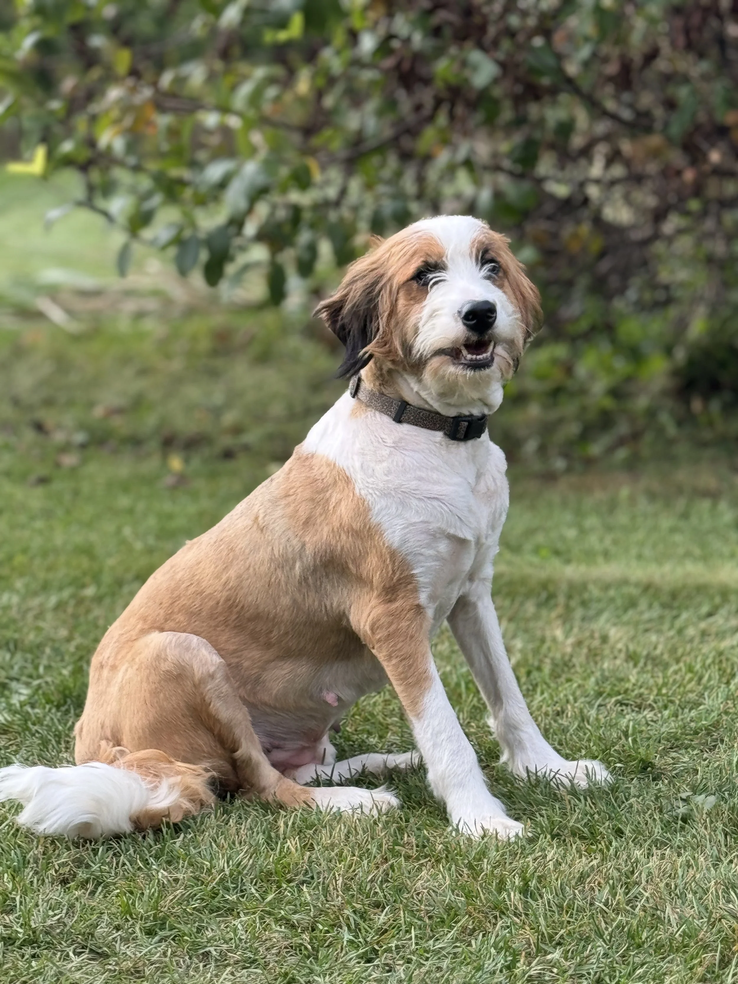 Belly is one of our most affectionate F1 Mini Bernedoodles, weighing about 40 lbs. She’s fully genetically cleared and has outstanding conformation and temperament. Belly’s a true “people dog” — always nearby, always gentle, and incredibly intuitive. Her puppies tend to have her happy, adaptable nature and gorgeous soft coats.